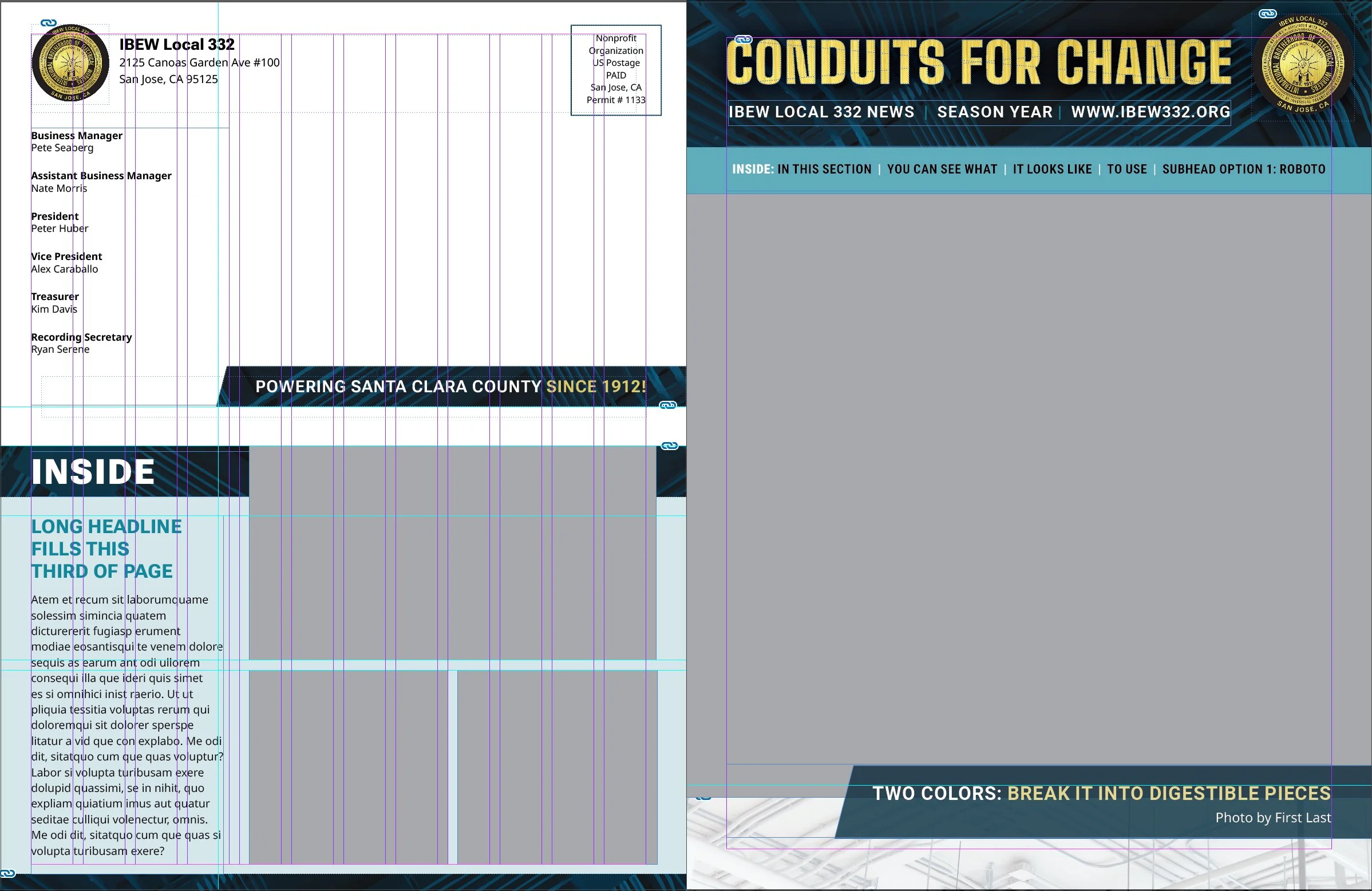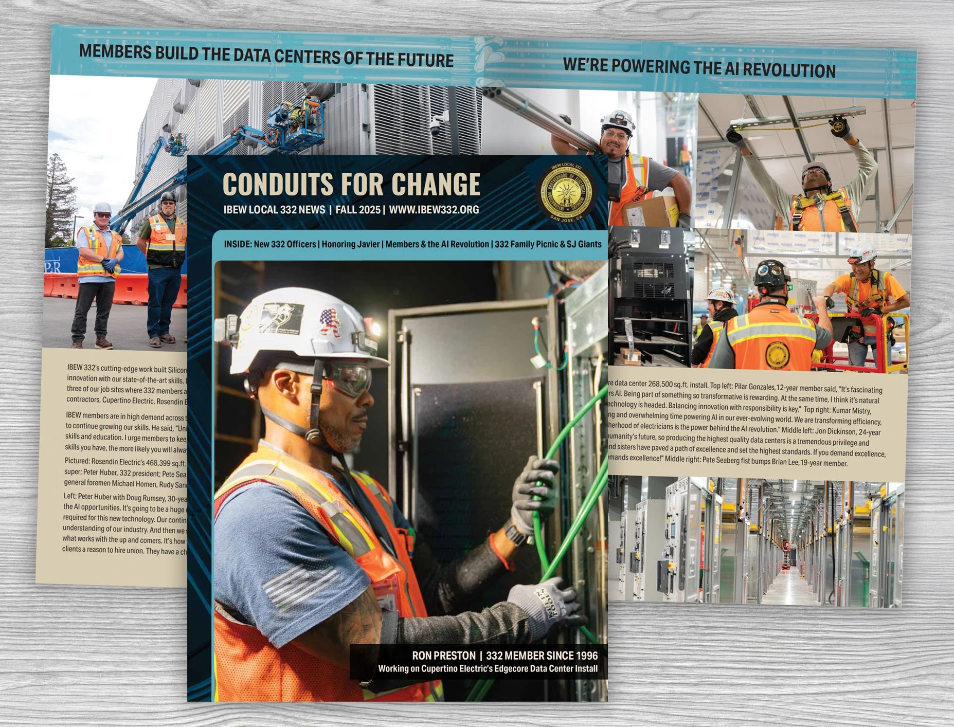 IBEW Local 332’s quarterly news magazine plays an important role in keeping members informed, connected, and engaged. Each issue brings together updates from across the union—from major job sites to member spotlights—requiring a layout that can support a wide range of content while remaining clear and easy to navigate.
