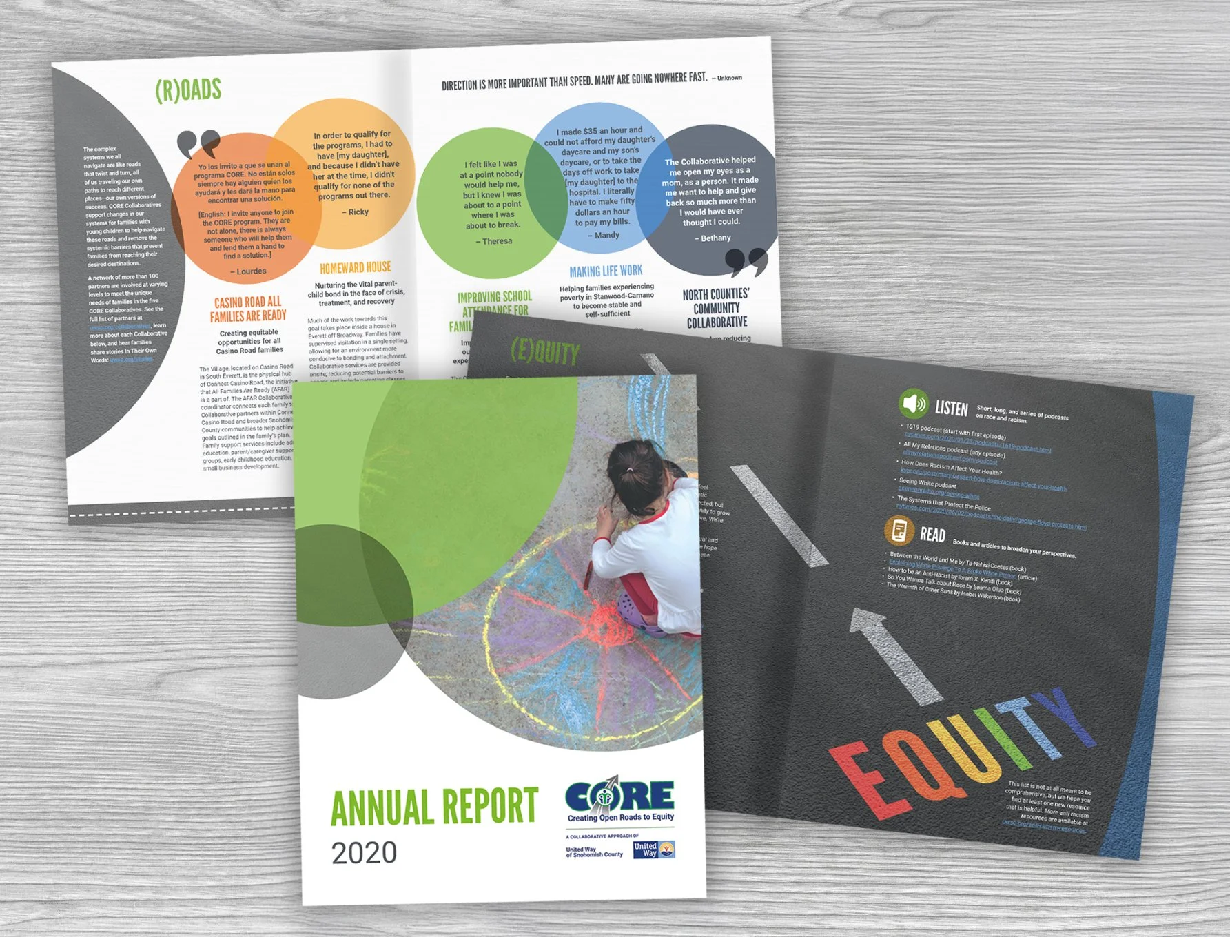 For United Way’s CORE initiative, I led design and production of four annual reports, evolving the brand’s visual language to reflect the organization’s deeper focus on community collaboration and addressing root causes of need. Each edition refined the color palette, typography, and layout systems—balancing data visualization with human storytelling—to create a consistent, trusted voice across print and digital platforms. The series showcases how thoughtful iteration can strengthen a brand’s identity while keeping its message fresh and relevant year after year.